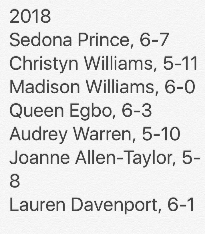 #8 Madison Williams, 6'1" Wing from Trinity Valley near Fort Worth. Very little information available. No known schools of interest. Yet she is very highly regarded. (Oklahoma)