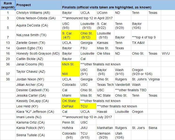 DeCosta and Honesty will both be there for their last stops., and I've heard that both have serious interest in Baylor. Decosta and Williams both have Tennesse on their list and they are rumored to want to play together. Another thing to look out for is Decosta is from South Carolina area so she could just choose to go back home.