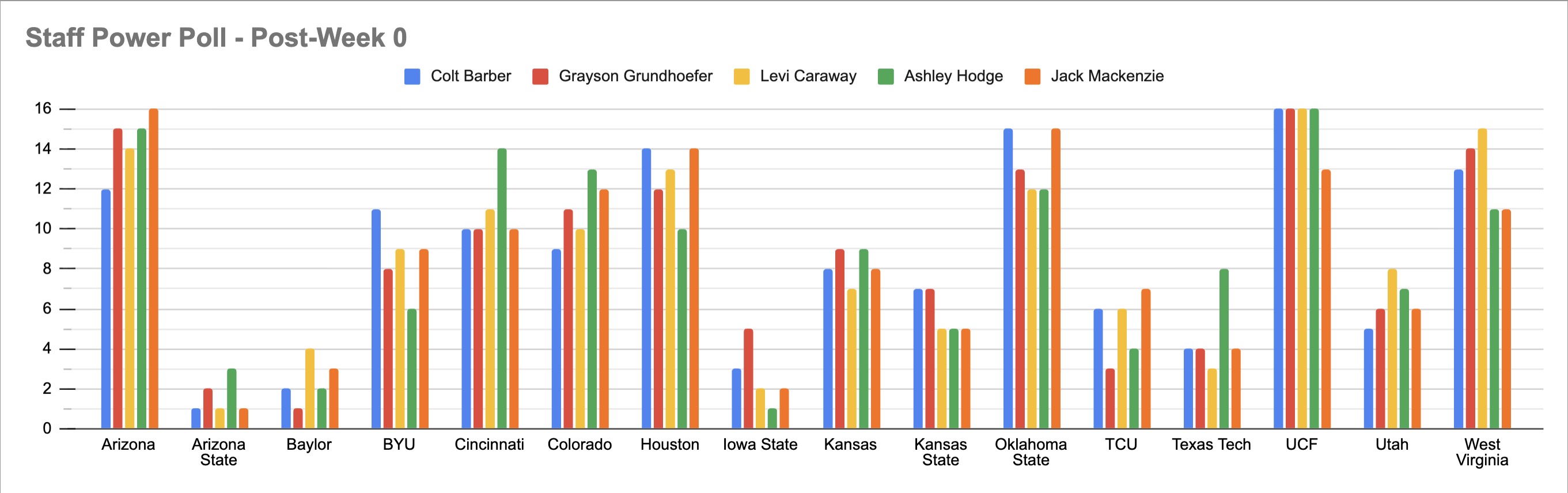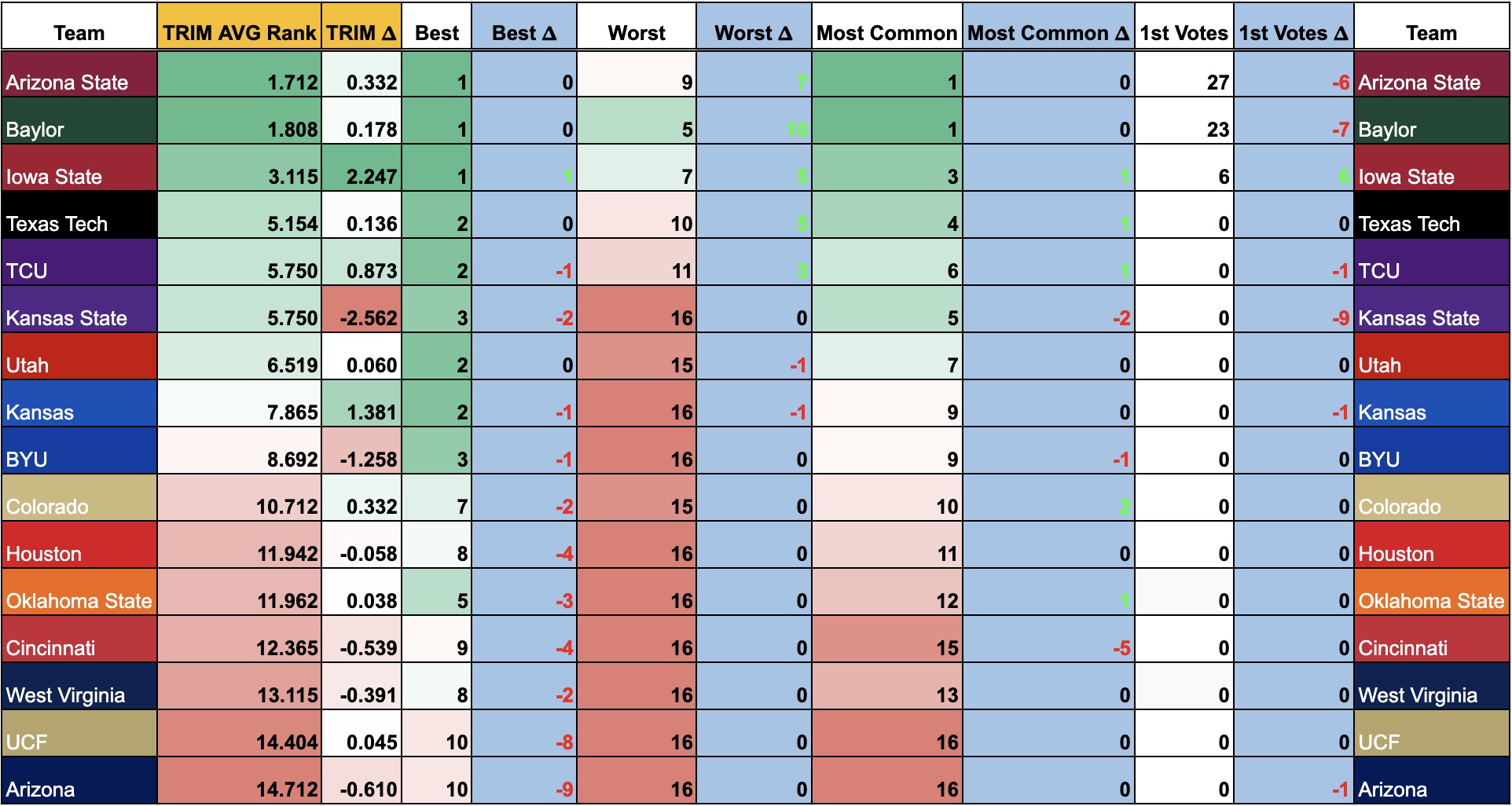 We went from 6 teams with a first-place vote down to just three this week: Arizona State, Baylor and Iowa State. Opinions typically do consolidate once games start being played.
