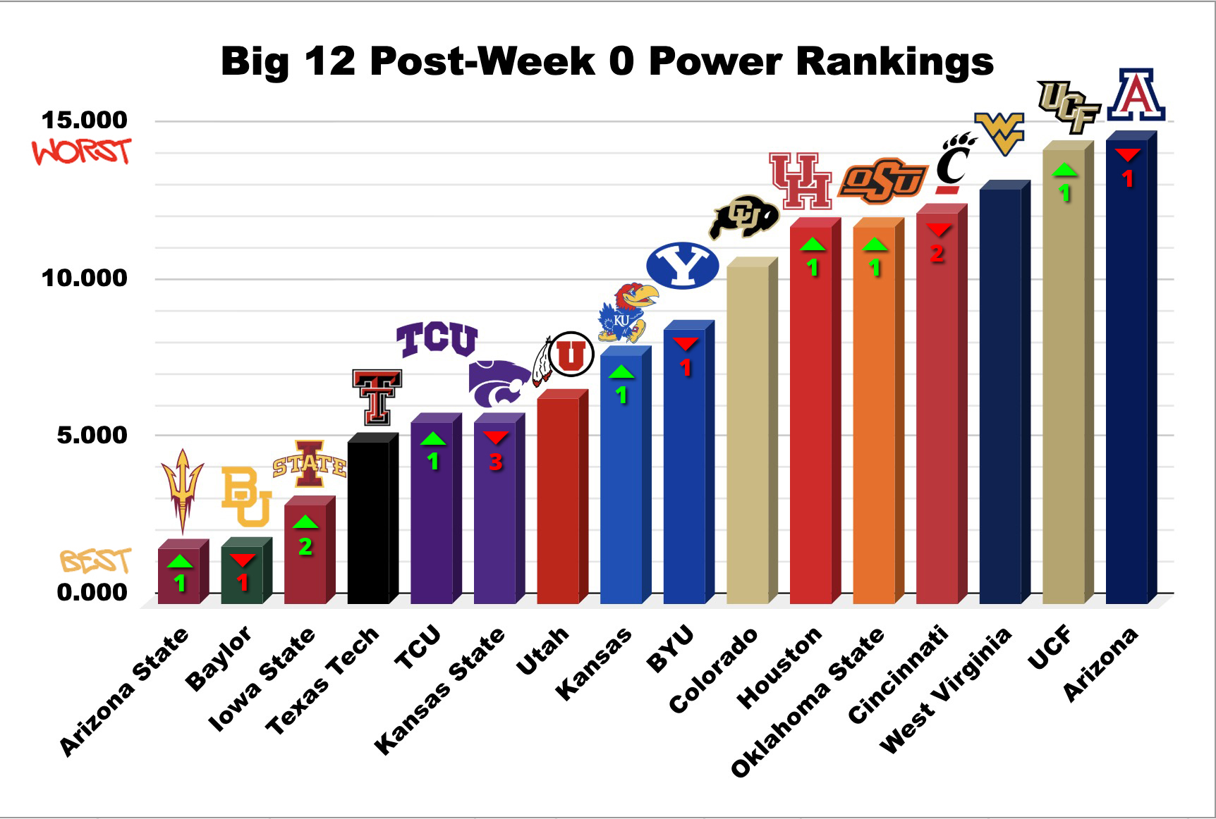 There were plenty of small changes that make sense given the change in respondents. Baylor moving down to No. 2 is notable as this is a poll of Baylor fans, but I chalk that up to heightened nerves ahead of the season opener against a solid SEC squad.