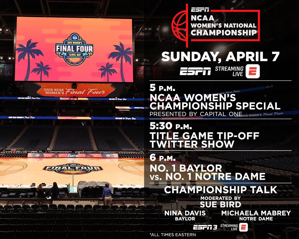 The reason everyone plays the game arrives Sunday April 7 in Amalie Arena. The Baylor Lady Bears will face the Notre Dame Fighting Irish in a battle between two of the top programs over the past 15 years. Both have two national titles during that time and this will be a game of strength on strength in the paint and perimeter. Baylor is 36-1 and Notre Dame is 35-3 on the season with Baylor having a 28 game winning streak and Notre Dame with a 14 game winning streak on the line.